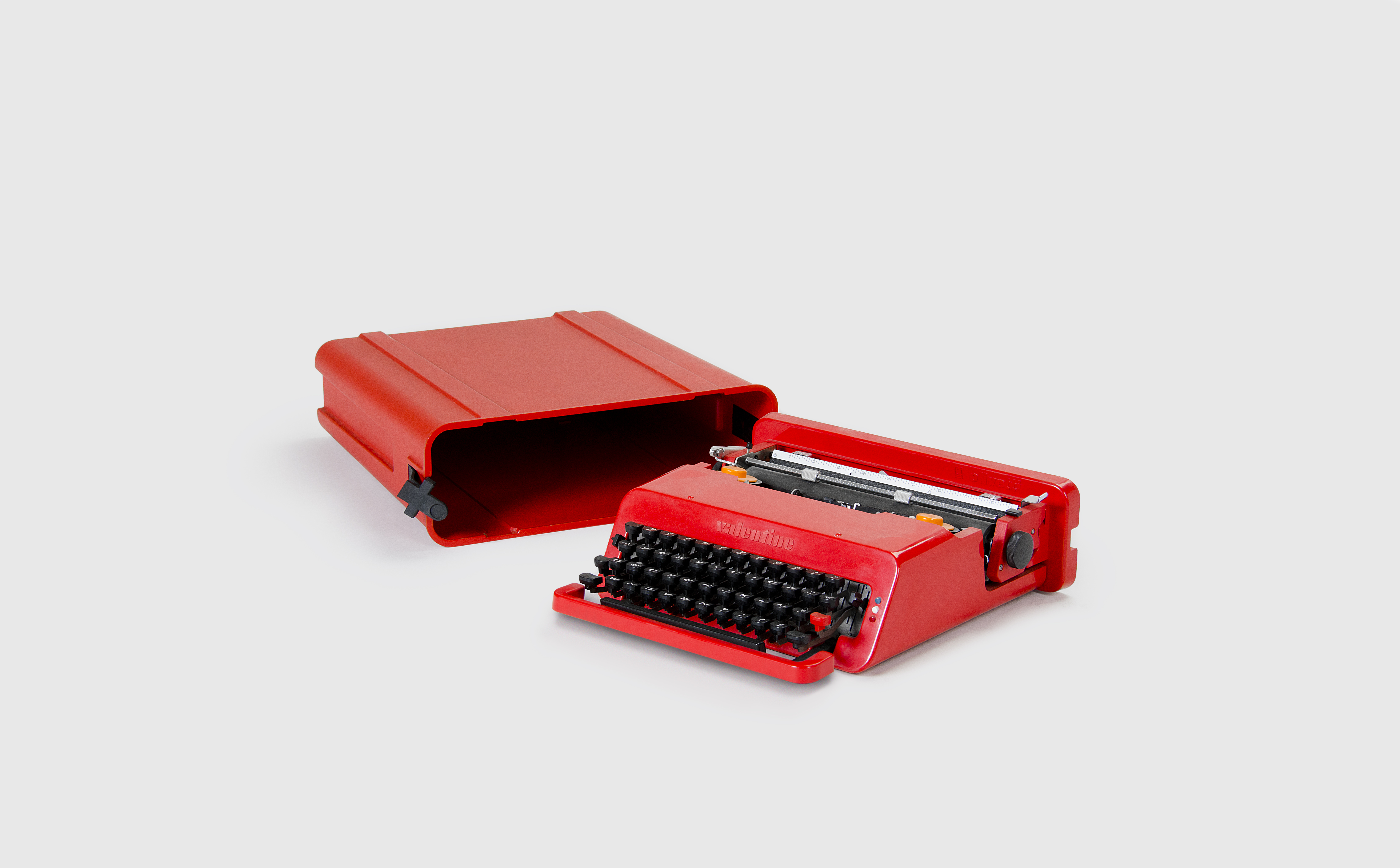 En 1969, Ettore Sottsass (nommé dès 1958 et à 23 ans seulement, responsable du département design d’Olivetti) conçoit la machine à écrire Valentine. Bien que la firme italienne créa en 1965 le tout premier ordinateur de bureau, il est amusant et paradoxal de souligner qu’avec la Valentine, le designer, devenu précurseur puis pape du postmodernisme, a relooké en container nomade et coloré une technologie bientôt démodée.