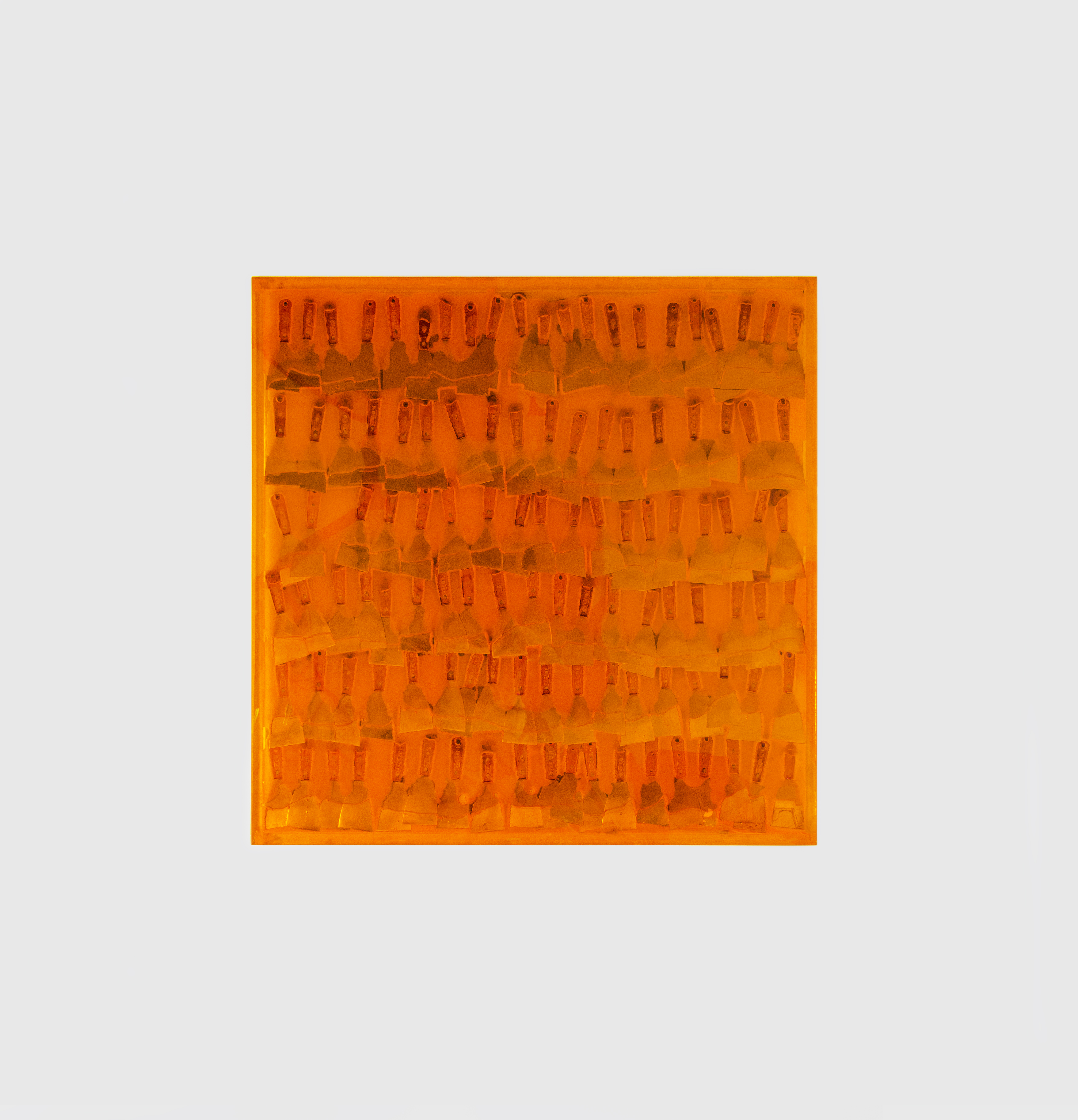 Tenant du nouveau réalisme dont il est une figure majeure, Arman propose ici une nouvelle perspective du réel. Cette accumulation de grattoirs de tapissiers emprisonnés dans une résine orange magnifie l’objet usuel. Cette création popart, mélange d’optimisme et de sérieux, permet d’explorer les paradoxes de la société de consommation. Ces grattoirs sont une illustration de la «poésie pure de la chimie industrielle» selon les mots du critique Pierre Restany.
